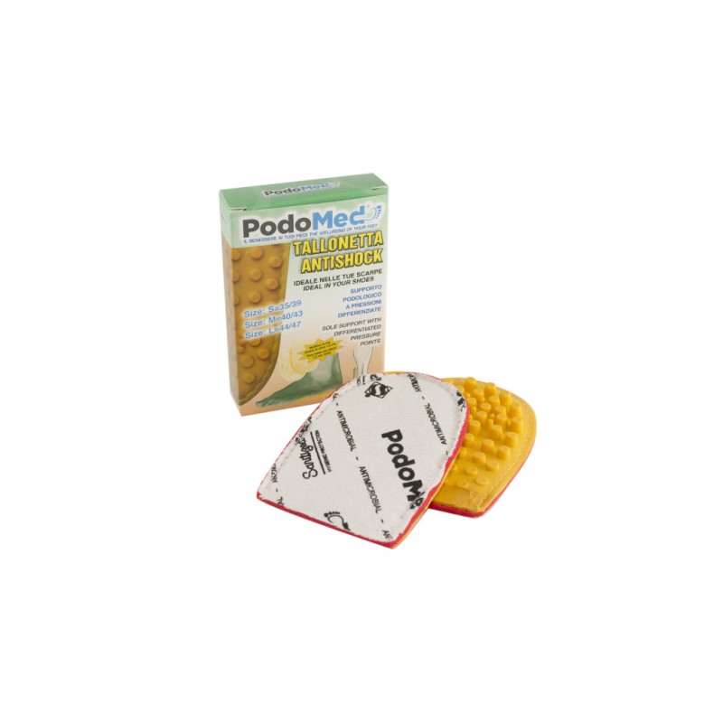 La tallonetta PodoMed realizzata con miscele di materiali elastici attutisce l'impatto al suolo e conferisce maggiore energia al movimento. La tallonetta PodoMed è adatta a tutte le calzature tradizionali , da lavoro e sportive. La parte superiore è realizzata in cotone antibatterico e anti-odore e la parte sottostante è composta da piolini in lattice che esercitano un massaggio energetico su tutta la zona plantare. La tallonetta PodoMed serve a prevenire le talloniti ed a spostare il proprio peso verso il mesopiede quando il tacco della calzatura risulta essere troppo basso. La tallonetta è lavabile a 60/70°C.